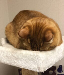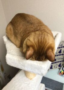 キャットタワーのてっぺんでごめん寝。かわいい…。
